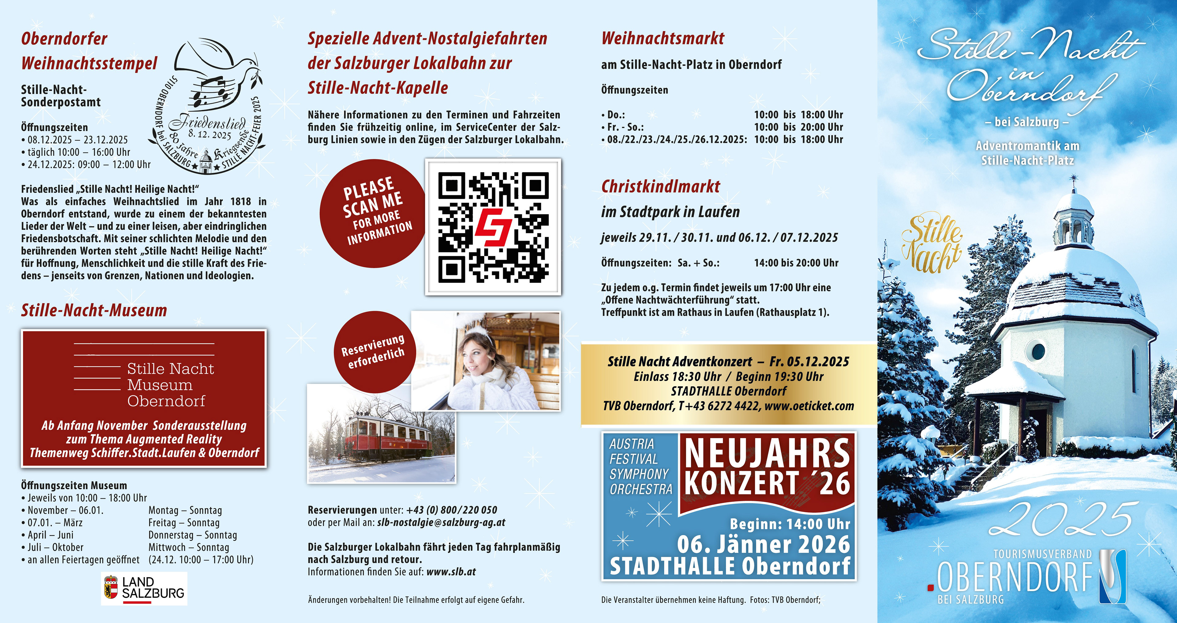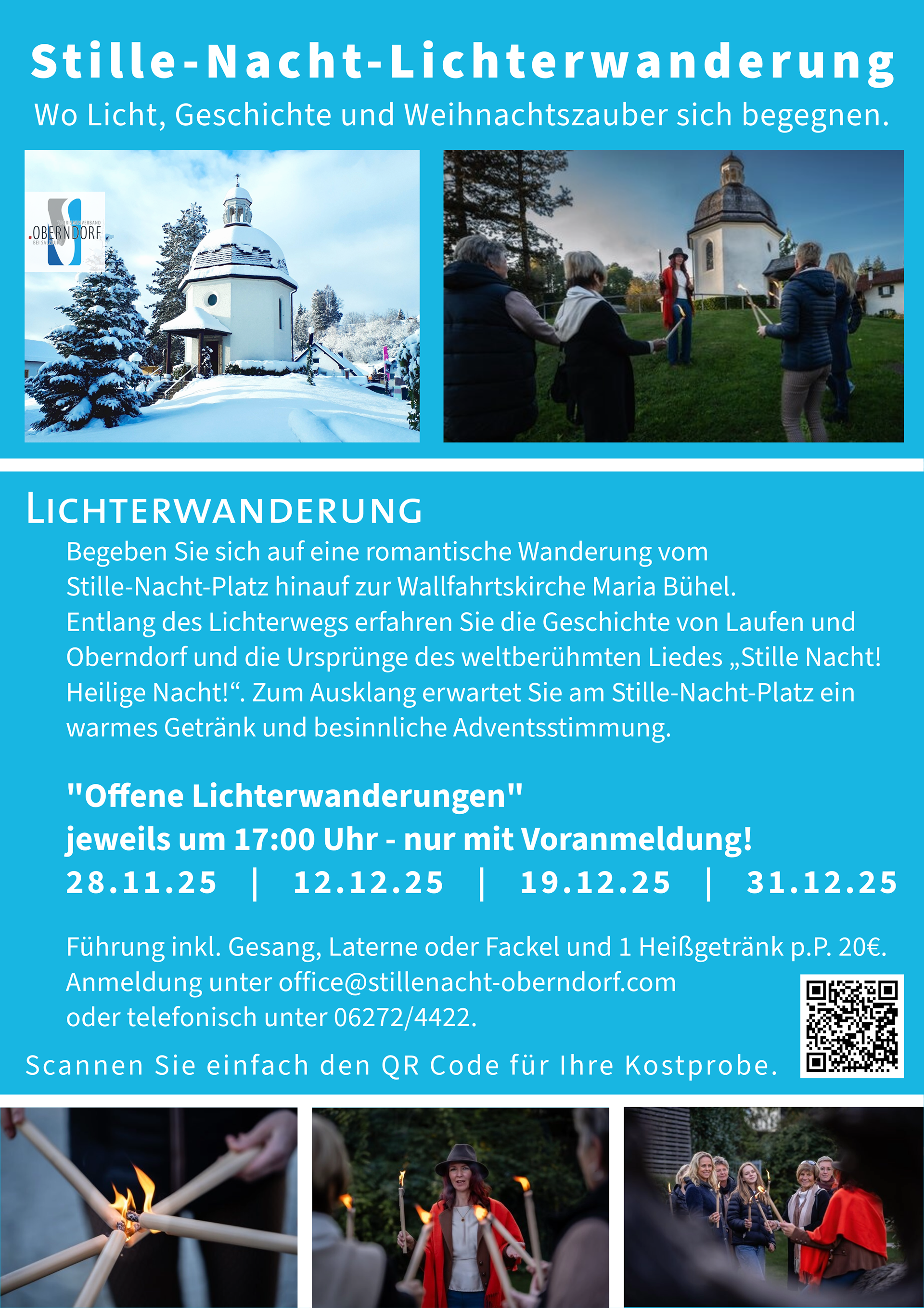 Die geführten „Offenen Lichterwanderungen“ finden jeweils um 17:00 Uhr an ausgewählten Terminen statt und beinhalten Gesang, eine Laterne oder Fackel sowie ein Heißgetränk pro Person. Eine Anmeldung ist erforderlich unter office@stillenacht-oberndorf.com / telefonisch unter +43 6272 4422.